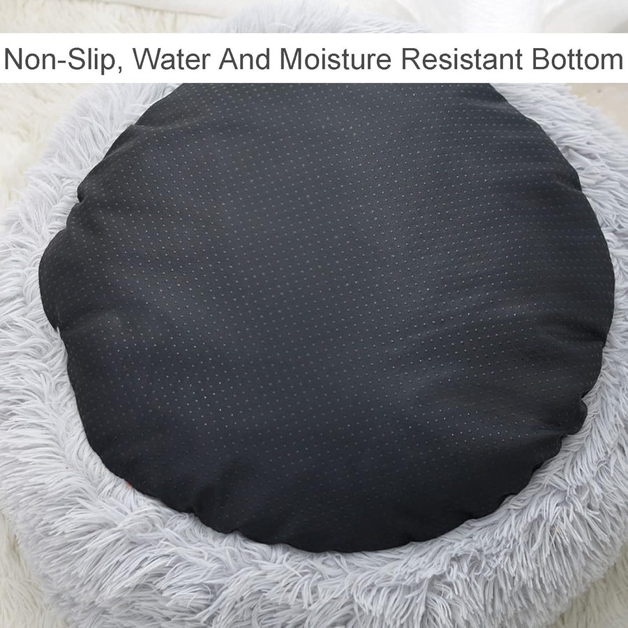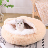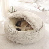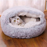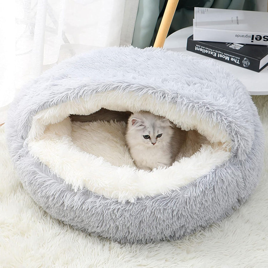 The Plush Fluffy Pet Bed features a hooded, cave-like structure that offers a secure and comfortable retreat for your pet.